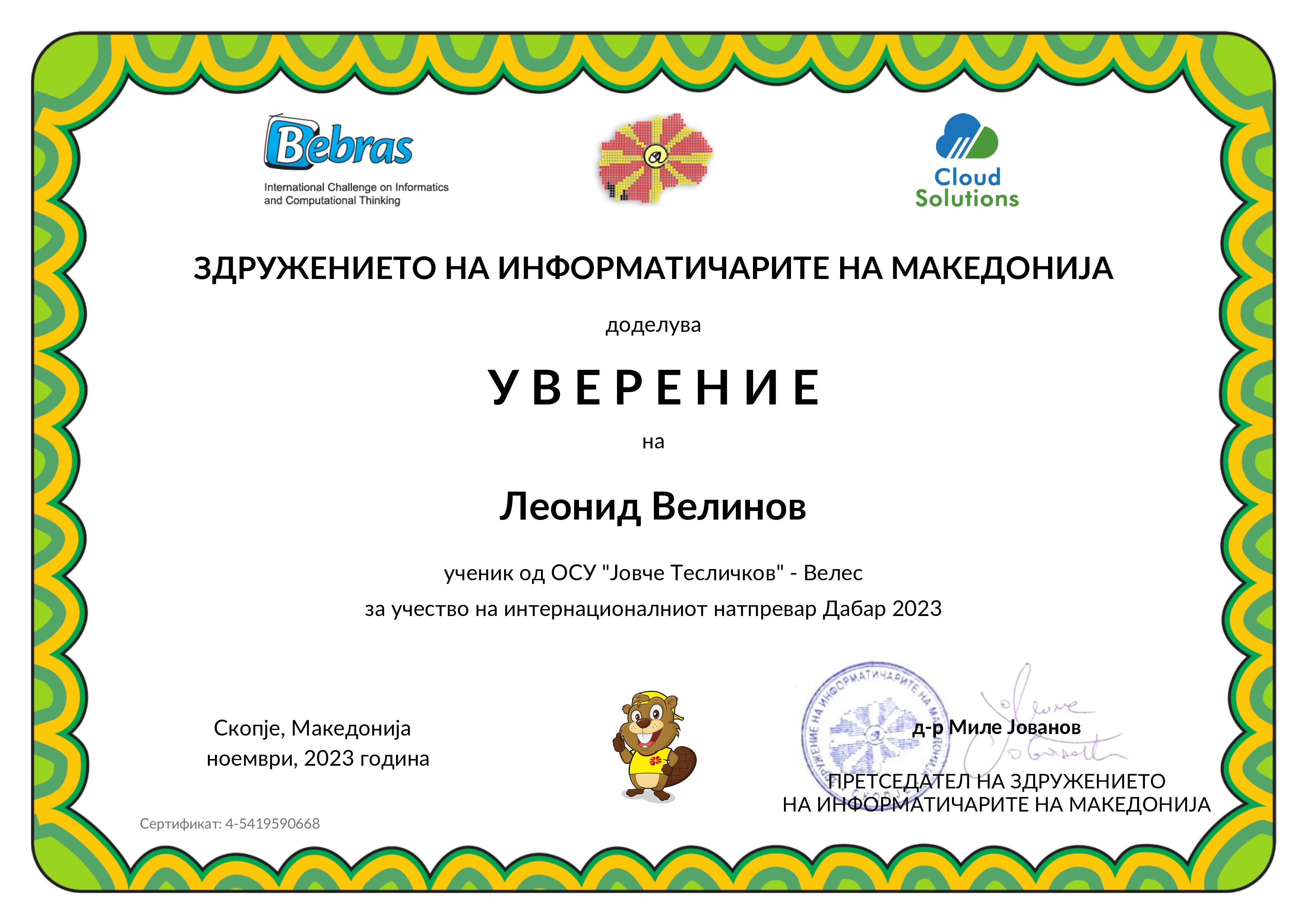 I, Antonio Panovski, professor of Informatics at OSU "Jovche Teslichkov" Veles and class teacher of class 1a, confirm that the student Leonid Velinov, in this first year, has shown dedication, diligence, reliability, responsibility, and consistency in carrying out school and extracurricular activities.